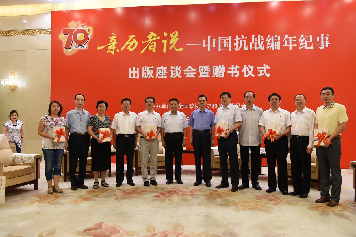 人民政协网北京8月31日电 2015年8月31日下午,由全国政协文史和学习委员会主编、人民出版社出版的《亲历者说—中国抗战编年纪事》图书出版座谈会暨赠书仪式在全国政协礼堂举行?;嵋橛扇氖泛脱拔被嶂靼?,全国政协办公厅、文史和学习委员会有关领导、部分全国政协委员和中共中央党史研究室、国家新闻出版广电总局、民革中央、中国社会科学院近代史研究所、国家图书馆、北京市政协、中国人民抗日战争纪念馆等有关单位负责同志,部分抗日老战士、抗战将领后人代表等约50人参加座谈会。