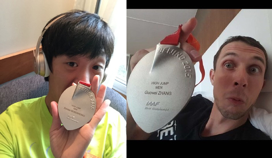 【新民网讯】北京时间9月1日消息,2015年北京田径世锦赛已经落下大幕,但与这届世锦赛有关的故事还没有结束,中国跳高名将张国伟今天在社交网络上晒出了自己的银牌,但这并非炫耀,而是告诉大家一个有意思的消息,他和邦达连科拿的是对方奖牌。