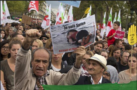 当地时间2015年9月5日,法国巴黎,法国民众高举标语,参加示威活动,要求欧洲改变难民政策,接收难民。