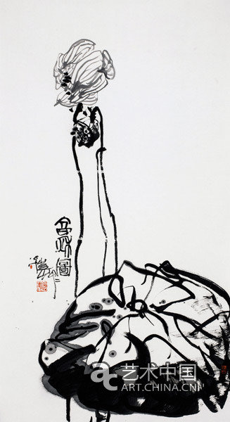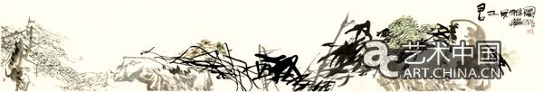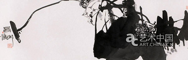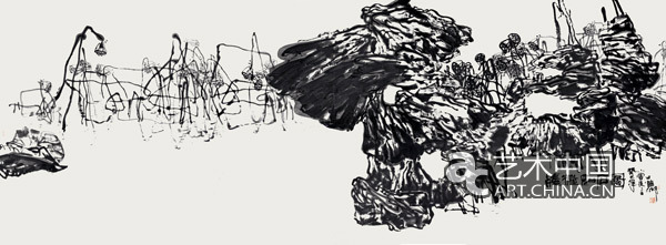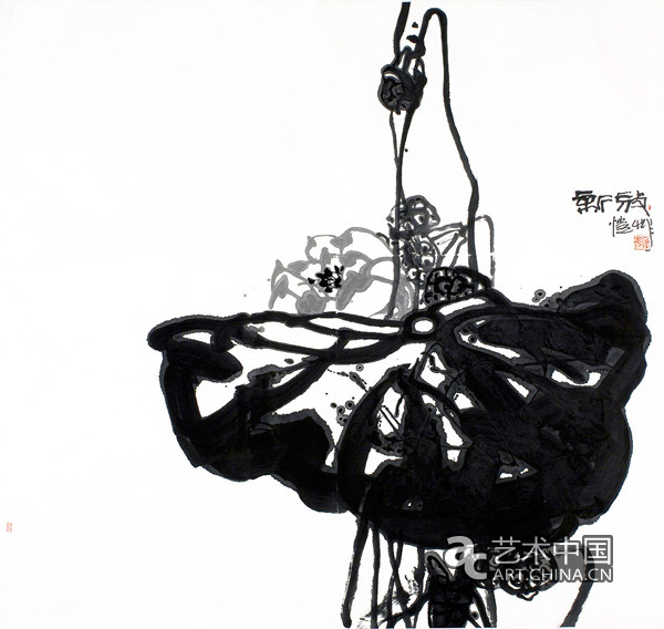 大幅写意画具有的强大冲击力,在现代大型展览场所里体现得最充分,其展示形式亦符合现代欣赏者的审美习惯;全幅画面一举呈现,扩展了观众对于水墨画的视觉感受;作品巨大的尺幅、浓重的笔墨,使其与重彩油画、前卫艺术同台并置,气势分毫不让。这就要求画家具有非凡的掌控与驾驭能力,对于墨色的浓淡分布,笔线的疏密间杂,都要有通盘协调,如统帅指挥战阵、灵活调度,千军万马随其令旗挥舞而盘旋奔突。曳笔游走于巨幅之内,画家全身投入画面舞台,恍若进入自发的周旋运转状态,心随笔运、身与笔化,身心之运作完全契合笔与纸之协同运化,而共同应合于天运,亦即物我浑然同体的自行运动。