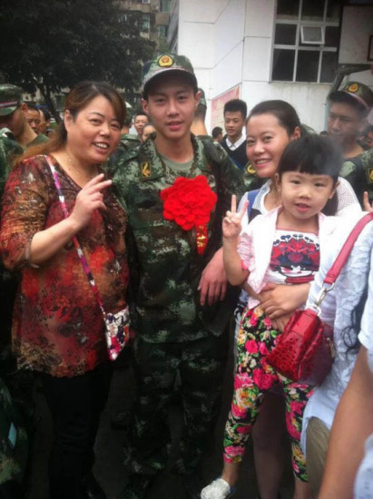 未满18岁的四川男孩袁海去年到天津当消防兵,姐姐袁媛(右二)为他戴上大红花。