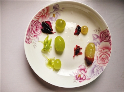 这种说法是否有道理?昨日,新京报记者走访了朝阳区几家水果店,购买了“美人指”、巨峰等四种葡萄和一种绿提,以及四种苹果做对比。实验发现,剥开皮两小时后,四种葡萄皮和绿提皮的表面颜色变化并不明显;而苹果表面的颜色逐渐变黄。