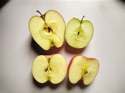 四种苹果切面均由原来颜色逐渐变黄,且呈丝状。其中两种红富士苹果表面黄色变化较为明显。蛇果表面的半侧相对明显,绿苹果的变化则最不明显。