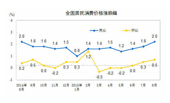国家统计局今天发布的2015年8月份全国居民消费价格指数(CPI)和工业生产者出厂价格指数(PPI)数据显示,CPI环比上涨0.5%,同比上涨2.0%;PPI环比下降0.8%,同比下降5.9%。