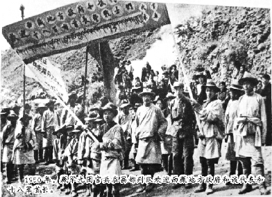 1950年,藏军九团官兵在昌都列队欢迎西藏地方政府和谈代表和十八军首长。