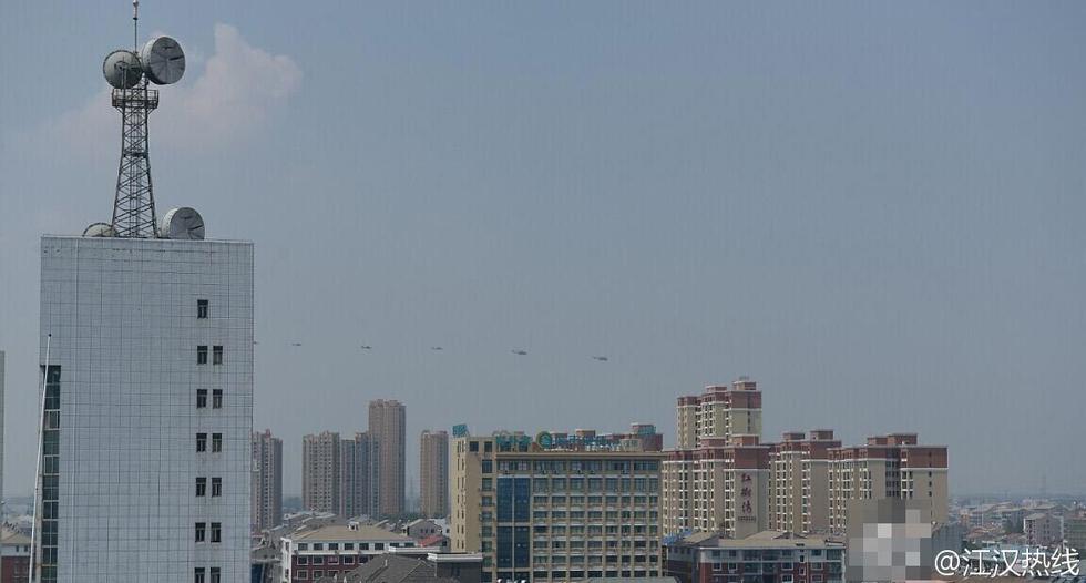 机群飞临城区上空,巨大轰鸣声、队形变换的震撼场面引起全城关注。图为飞行在湖北仙桃上空的直升机。