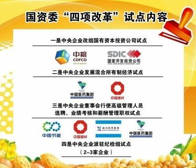 2014年7月15日,国资委深化改革领导小组办公室主任彭华岗表示,6家央企入选首批国资“四项改革”试点。6家试点企业分别是:国家开发投资公司、中粮集团、中国医药集团总公司、中国建筑材料集团有限公司、中国节能环保集团公司、新兴际华集团有限公司。