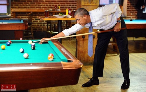 2014年7月8日,在科罗拉多州首府丹佛,美国总统奥巴马在酒馆里打台球。据报道,奥巴马此后将前往得克萨斯州会见得克萨斯州州长佩里。