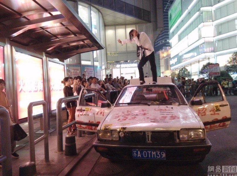 现场被当做舞台的轿车是一辆破旧普桑,车身印着“名人杰克逊”、“招生”等字样和一个手机号码,打开的后备箱里放着音响设备,一直播放着杰克逊的经典歌曲。