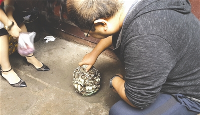 昨日上午9点,王先生在十陵的菜市场买完菜回家,发现路边围了不少人,一个穿着迷彩裤,上身穿建筑工地服装的40多岁的男子,摆出了一个黄泥包裹的石头。