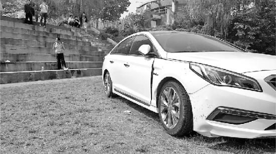 肇事车辆停在操场南侧,右前轮附近有明显的血迹。记者高歌 摄