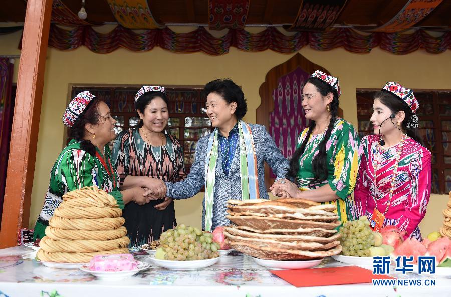 9月26日,中共中央政治局委员、国务院副总理、中央代表团副团长刘延东率中央代表团分团到和田地区看望慰问各族干部群众。这是刘延东在和田市吉亚乡喀勒塔吐格曼村与维吾尔族群众在一起。新华社记者张领摄