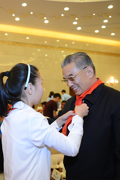 青少年为十一届全国政协副主席、党组成员李金华佩戴红领巾。人民政协网记者 田福良 摄