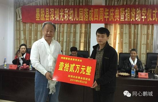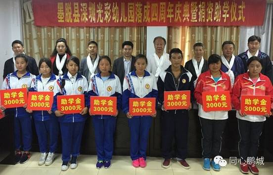 在藏期间,深圳“光彩事业西藏行”成员还来到由深圳光彩事业促进会捐建的深圳光彩幼儿园,举行了“墨脱县深圳光彩幼儿园落成四周年纪念暨捐资助学仪式”。深圳光彩事业促进会向墨脱深圳光彩幼儿园捐款2万元,向40名贫困学生捐赠助学款12万元。受助学生代表、门巴族高三女学生尼玛拉姆向来自深圳的客人们表示了衷心的谢意,并表示将刻苦学习、立志成才,以优异的成绩回报各界的爱心,以感恩之心回报社会。