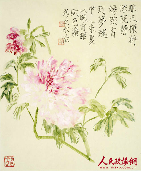 何水法一生以花为美,以花入画,而在中国花鸟画中,又精于牡丹,牡丹是他快乐的源泉之一。“牡丹有吉祥如意的意思,是群众喜闻乐见的一种题材,从两宋元明清到近现代,许多花鸟画大家都画过牡丹。”何水法谈到,“我很亲近牡丹,70年代画了大量的牡丹写生稿。为了画好牡丹,我去过12次菏泽,也多次去过洛阳,甚至,我现在的抱华楼美术馆里,也种了100多株各类品种的牡丹。”谈到牡丹,何水法十分动情,“我把牡丹看做我的老朋友,时刻惦记着牡丹开得好不好,也时不时去菏泽、去洛阳,就像看望我的老朋友一样。”何水法说:“花看我,我看花,物我两忘。我把所有花儿都当成朋友,例如,杭州的花在哪儿、哪儿的花是最好的,我都清清楚楚。”
