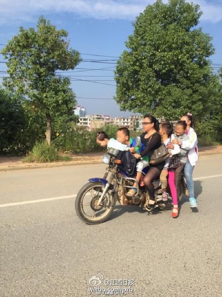 原标题:江西一女子骑摩托车载7人 马路上演"叠罗汉"