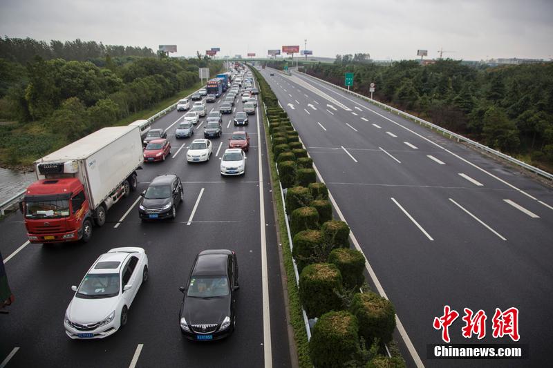 10月1日,江苏南通,车辆在沈海高速苏通大桥南通段缓行。朱吉鹏 摄