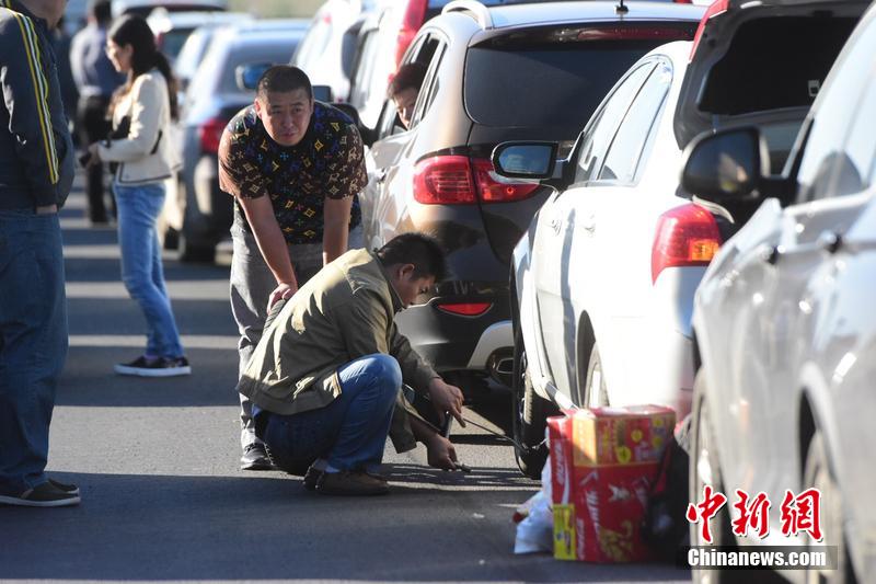 10月1日,十一黄金周第一天,受出京自驾游玩车辆增多影响,京沪高速泗村店路段严重拥堵。图为一位司机正在换轮胎。小可 摄