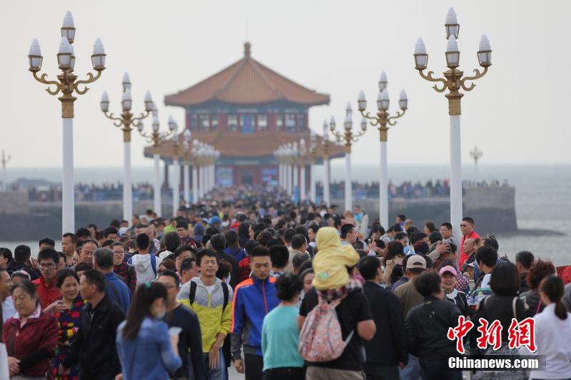 10月01日,山东省青岛市,国庆长假第一天迎客流高峰,前海各景区游客爆棚,海内外游人纷纷前来亲近大海,乐享假日?;平芟?摄