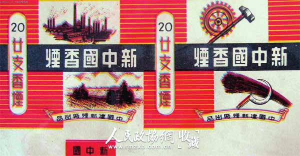 新中国成立之初,百废待兴,改造老牌号、创立新牌号是烟草界的当务之急。有些老牌号沿用了多年,但大部分牌号被清理。上世纪50年代的烟标,多以欢庆祖国解放为主题。从烟标品牌名看,有“欢庆”、“祖国”、“解放”、“和平”和“幸福”等;从烟标图案看,有手执锤子、镰刀,高举火炬的工农形象,有烟囱、拖拉机、齿轮、铁锤和麦穗组合的工农联盟图,有集和平鸽、华表为一体的天安门光芒四射图案等等……这些新中国早期烟标图案的设计,都很贴近时代。早期烟标里,还有部分题材是反映重要事件的,如上世纪50年代的“抗美援朝”等,烟标上印有“抗美援朝、保家卫国”、“维护世界持久和平”等口号。