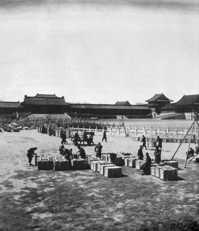 1933年,日寇的铁蹄步步紧逼华北,故宫博物院决定将故宫中的国宝运往南方。图为工作人员在太和殿前广场为南迁的古物装箱。