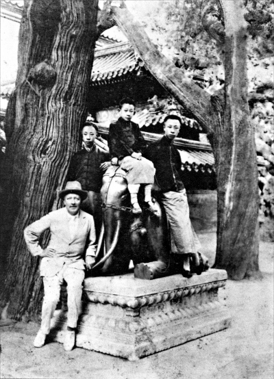 逊位后的溥仪(右一)、婉容的弟弟润麒(右二)和师傅庄士敦在故宫中合影。