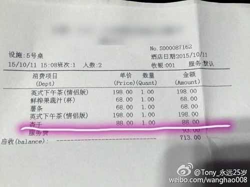 10月11日晚,网友@Tony_永远25岁在微博发帖投诉称,当天在无锡某酒店喝下午茶,结账时看账单,发现一个没有点的88元的杏干,便询问店员。