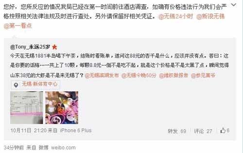 10月12日中午无锡市物价局通过官方微博回应该网友称:所反应的情况物价部门已经在第一时间前往酒店调查,如确有价格违法行为将严格按照相关法律法规及时进行查处。