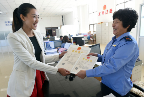 “一照一码”改革惠及企业。10月12日,河北省永清县工商局工作人员在为企业代表发放“一照一码”营业执照 。新华社图
