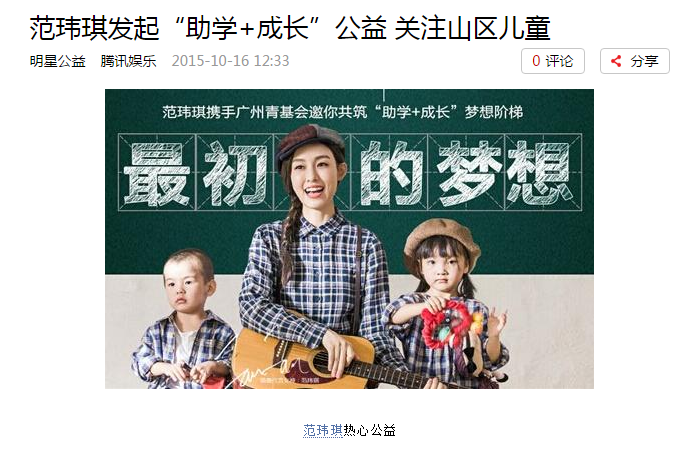 范玮琪发起“助学+成长”公益 关注山区儿童