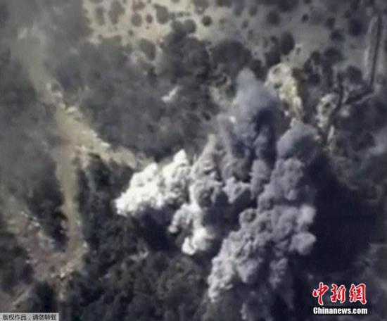 资料图:俄罗斯持续空袭叙利亚境内恐怖组织。俄国防部公布的视频显示俄罗斯战机空袭叙利亚境内极端武装时,导弹击中了弹药库引发大规模爆炸。