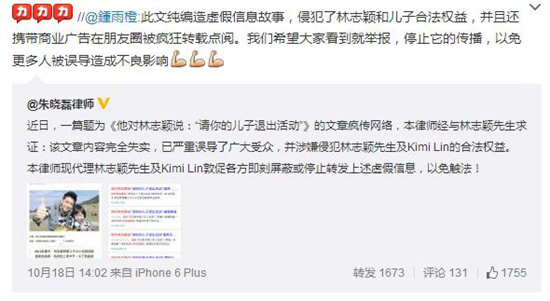 对此,昨日,林志颖委托律师发表声明,称:“该文章内容完全失实,已严重误导了广大受众,并涉嫌侵犯林志颖先生及Kimi Lin的合法权益。本律师现代理林志颖先生及Kimi Lin敦促各方即刻屏蔽或停止转发上述虚假信息,以免触法!”