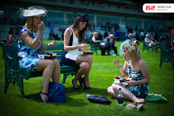 现在,每年英国人共消耗超过两亿五千万份炸鱼薯条。图为2013年6月19日,参加英国皇家阿斯科特赛马会的女士们坐在草地和长椅上吃炸鱼薯条。