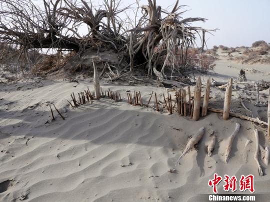 据塔大西域文化研究院博物馆馆长贾东介绍,来自阿克苏户外探险爱好者张文胜驾车在睡胡杨谷内探险时,发现了一些表面有序排列插着胡杨木的沙包,还发现有些沙包被挖得一片狼藉,人骨随意散落着。贾东与张文胜相约与此间10月19日来到现场勘查,发现表面没有遭到破坏的古墓群有3处,在现场捡到了一个人头骨。
