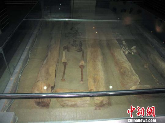 在十一团境内“昆岗2号古墓群”出土的干尸,两具存放在塔里木大学西域文化研究院。从玻璃柜、棺木的长度一眼就可以断定骨架的长度不少于两米?!⊙疃∩? src= 在十一团境内“昆岗2号古墓群”出土的干尸,两具存放在塔里木大学西域文化研究院。从玻璃柜、棺木的长度一眼就可以断定骨架的长度不少于两米。 杨东 摄