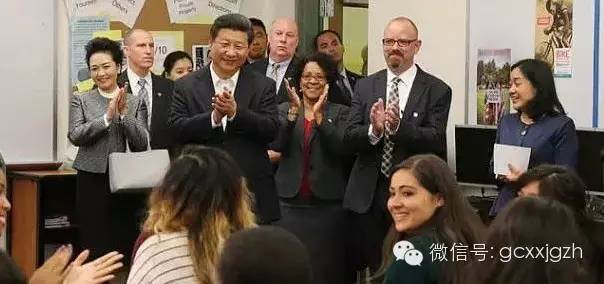 图:访美期间,习近平在林肯中学参观,右侧站立女性为周宇。
