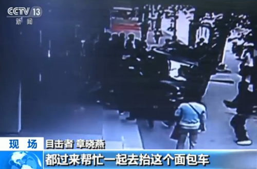 原标题:63岁环卫女工被卷入车底 路人合力抬车救人