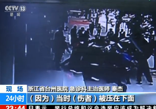 这名女环卫工看着年纪挺大, 穿着一件橘黄色的工作服,被撞后失去了意识。