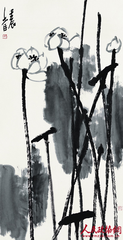邢少臣的大写意花鸟画使用的是独到的写意方式,以汉碑入画。他的线条中充满了刀刻的力量,饱含金石的味道,有魏碑的坚实,有汉隶的浑厚。大笔如椽,力若千钧,摧枯拉朽,却又难见机锋。汉碑的线条和鲜活的色彩交织融合在一起,线条欲压住色彩的恣肆,而色彩要突破线条的束缚。线条与色彩的冲突、交织与融合构成了邢少臣独有的拙重、雄浑、博大的艺术气质。
