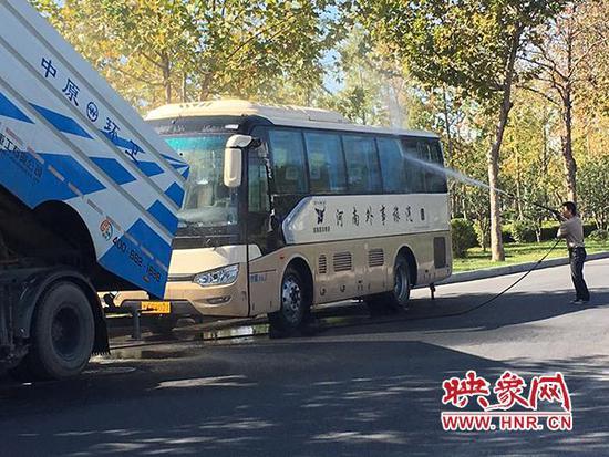 这辆车车牌号为豫AE0073的洒水车,车身上印有“中原环卫”字样。洒水车的尾部接出一根水管,一名男子拿着水枪向一辆大巴车喷水。旁边还站着一名男子一边抽着烟,一边与洗车男子有说有笑。大巴车的车牌号为豫AP6021,车身上写着“河南外事旅游”。