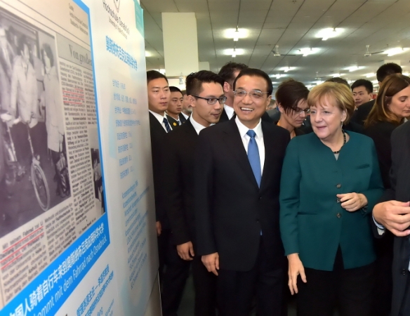10月30日,国务院总理李克强与德国总理默克尔共同参观安徽合肥学院。这是李克强与默克尔观看中德合作共建合肥学院30周年图片展。