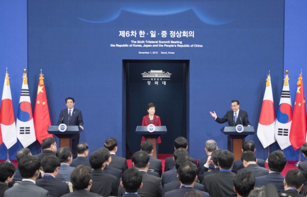 朴槿惠表示,韩中日三国领导人会议重启意义重要,三国加强合作不仅符合三国国民利益,也有利于东北亚地区稳定和繁荣。三国要坚持正视历史、面向未来的正确方向,增强推动三国合作的共识,共同开创东北亚和平安全新时代;携手应对全球经济困难,加强务实合作,强化创新经济机制,发掘新的经济合作增长点;促进经济社会平衡发展,落实好联合国2030年可持续发展议程,加强环保合作;扩大人员特别是青少年交流,加强教育和奥运经济合作,增进三国国民间感情;在重大国际问题上保持沟通协调,共同反对恐怖主义。三国合作是重要区域合作机制,要加强三国合作机制化建设。