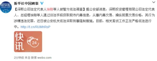 昨日,记者从公安部获悉,泽熙投资管理有限公司法定代表人、总经理徐翔等人通过非法手段获取股市内幕信息,从事内幕交易、操纵股票交易价格,其行为涉嫌违法犯罪,近日被公安机关依法采取刑事强制措施。目前,相关案侦工作正在严格依法进行中。