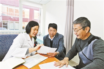 朝阳医院总药剂师刘丽宏(左一)与市医管局副局长边宝生(中)为患者制定用药方案 摄影/杨拥刚