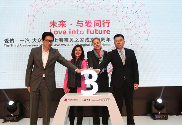 2015年11月2日,以“未来·与爱同行”为主题的“爱佑·一汽-大众奥迪上海宝贝之家”成立三周年暨未来三年战略合作签约仪式在上海举行。过去三年,一汽-大众奥迪累计投入超过3,000万元人民币用于宝贝之家病患孤儿的救助,截至今年10月,“爱佑·一汽-大众奥迪上海宝贝之家”共收治病患孤儿761名,其中707名孩子通过救助重获新生。未来三年,一汽-大众奥迪将继续与爱佑慈善基金会携手合作,每年持续投入1,000万元人民币,全方位支持病患孤儿的救助和宝贝之家的发展完善。