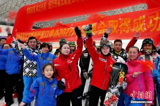 国家滑雪队运动员、滑雪爱好者在浙江绍兴乔波冰雪世界滑雪馆,庆祝北京冬奥会申办成功。