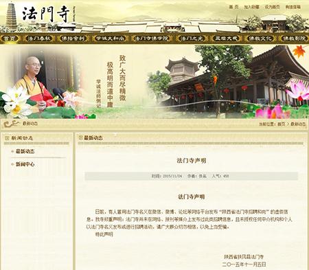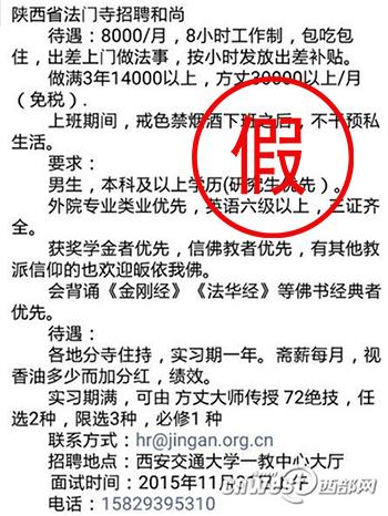 5日,陕西省法门寺发布声明说:“近期,有人冒用法门寺名义在微信、微博、论坛等网络平台发布“陕西省法门寺招聘和尚”的虚假信息。我寺郑重声明:法门寺并未在网络、报刊等媒介上发布过此类招聘信息,且未授权任何中介机构和个人以法门寺名义发布或进行招聘活动,请广大群众切勿相信,以免上当受骗。”
