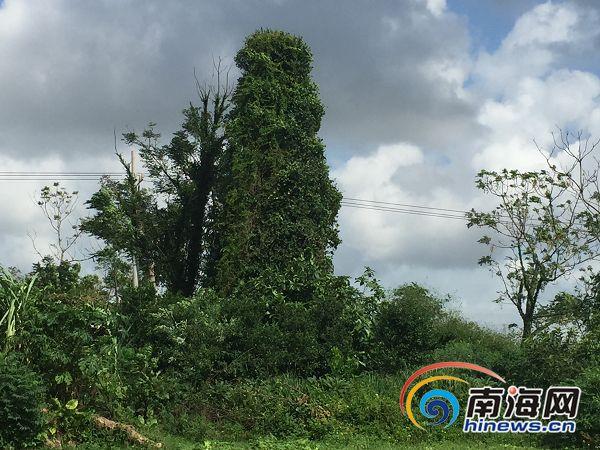 记者站在村口一条水泥路旁向田间远远望去,只见田间矗立着一座被绿色蔓藤完全覆盖的凸起物,宛如一棵大树,“树身”已严重向南倾斜大约30度。一旁的村民提醒记者:那棵倾斜的“大树”就是起云塔!