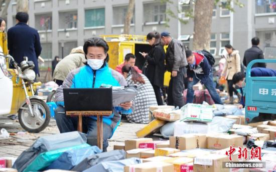 资料图:11月11日,中国民众每年一度的购物狂潮大幕开启,济南快递业“同城快递”率先启动投送热浪,济南一高??旒渌图械匕诼堑墓何锟旒?,取件学生络绎不绝。 中新社记者 张勇 摄