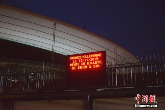 14日拂晓,法兰西球场外的显示牌还定格在袭击发生时的法国队与德国队的足球友谊赛上。 龙剑武 摄